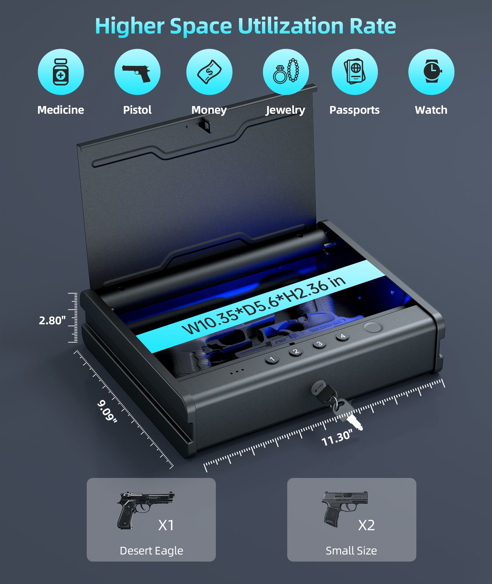 • šŸ”ć€Higher Space Utilization Rate怑 The gun safe for pistols can easily store 1 large pistolĀ  (2 small guns) and other precious items such as jewelry. It also can store 2 small size guns. Exterior Dimensions: 11.30" x 9.09" x 2.80", Interior Dimensions 10.35" x 5.6" x 2.36"
