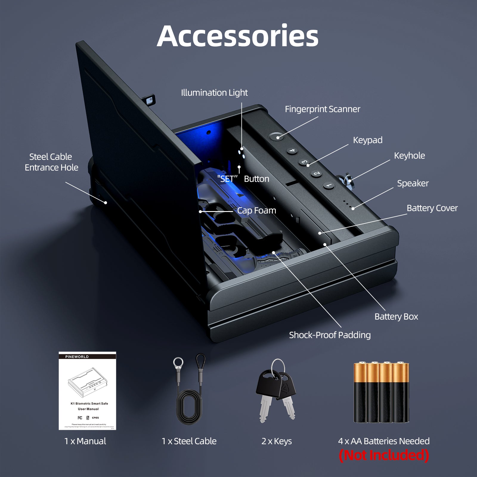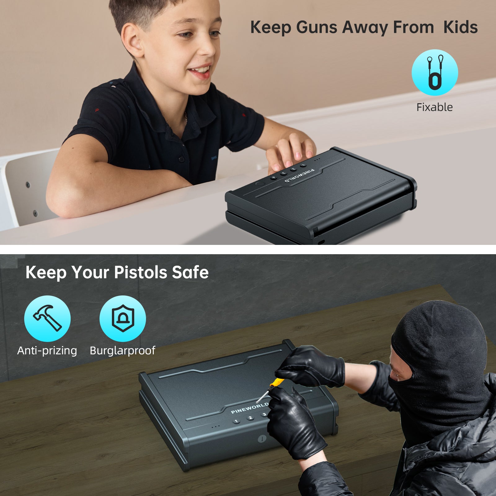 • šŸ”ć€3 Ways Quick-Access Biometric Gun Safe怑PINEWORLD fingerprint handgun safe can be quickly accessed via Fingerprint/Passcode/Key. It is ideal for pistols, cash, and other valuables. High definition fingerprint scanner with quick and easy access which is secure and user-friendly. Full digital keypad from 1-4. Mechnical key ensure the safe can be unlocked.