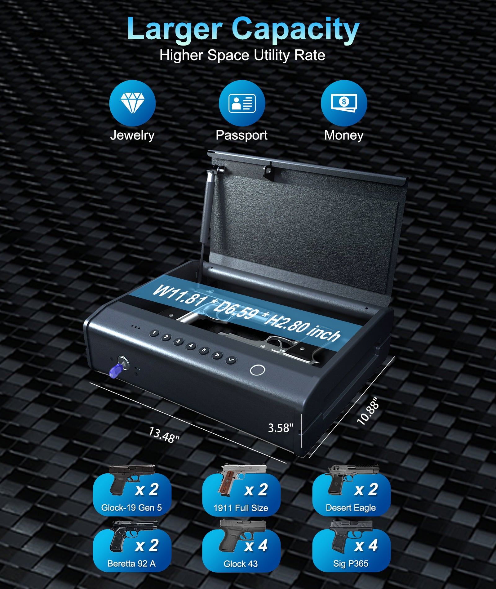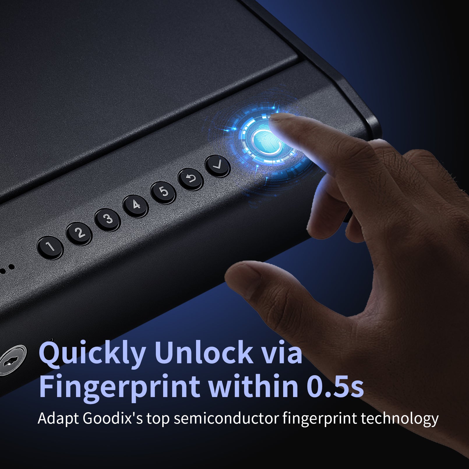 - šć4 Ways Quick-Access Biometric Pistols SafećPINEWORLD fingerprint gun safe can be quickly accessed via Fingerprint/Passcode/Key/APP. It is ideal for pistols, cash, and other valuables. High definition biometric scanner, full digital keypad from 1-5, mechnical key ensure the safe can be unlocked, APP controled is convenient which is secure and user-friendly.